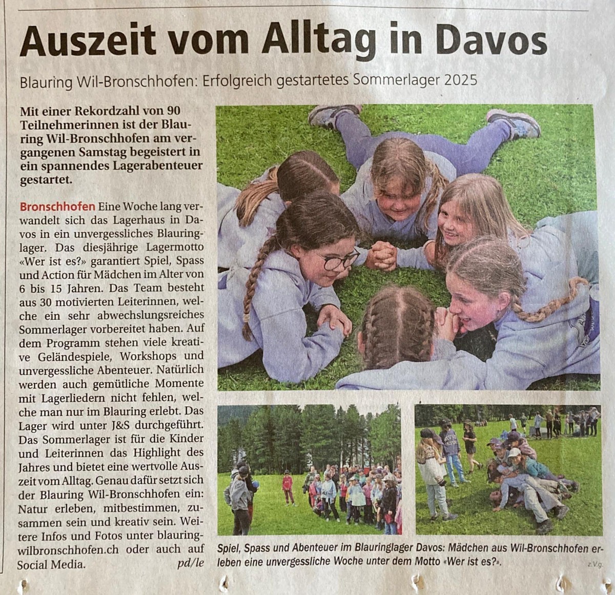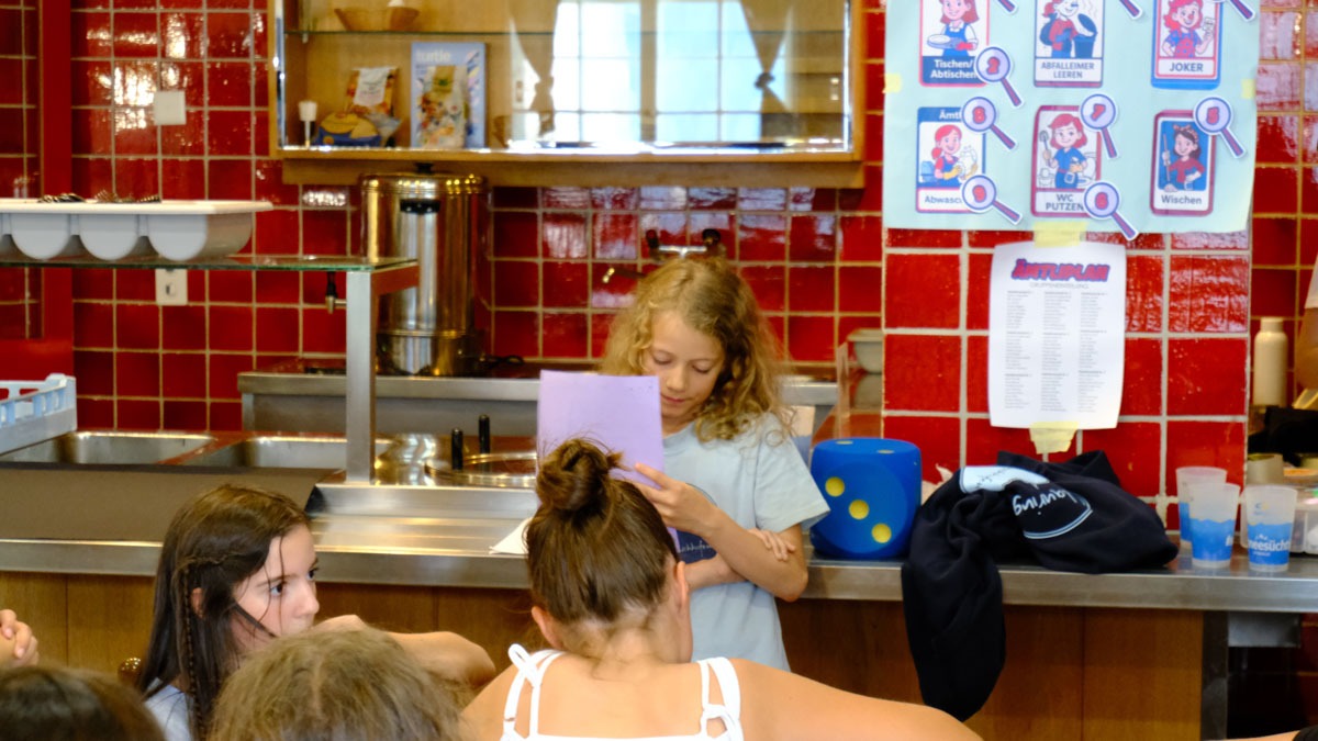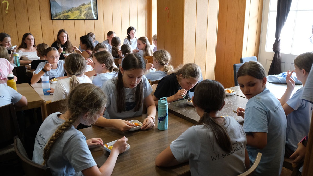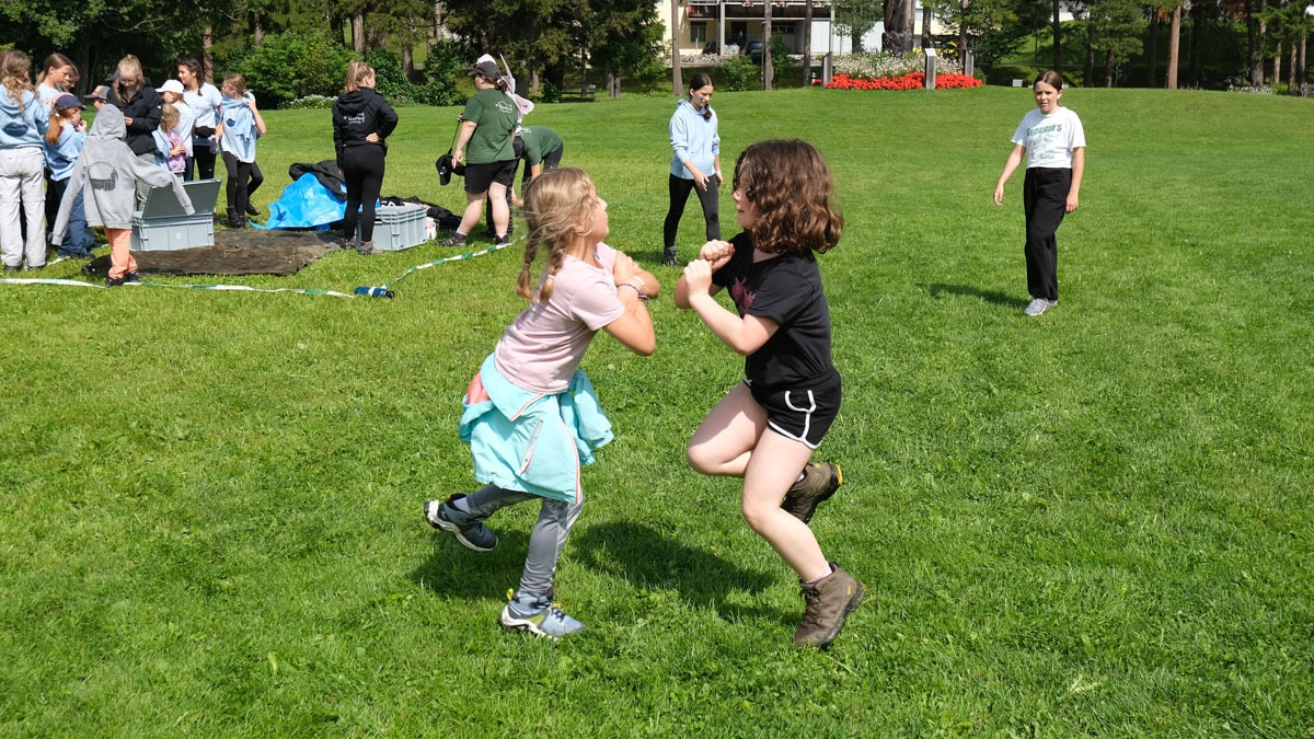 Am 4. Tag des Sommerlagers übernahm die älteste Gruppe das Programm und sorgte für einen abwechslungsreichen Tag. Gestartet wurde wie immer mit dem Morgensport. Danach ging es ins Geländespiel, bei dem die Kinder Baumaterialien entweder erkaufen oder erkämpfen konnten, mit viel Einsatz und Teamwork. Zum Zmittag überraschte uns die Küche mit feinem Kartoffelstock und Brätkügeli. Am Nachmittag wurde fleissig gebastelt: Die Kinder gestalteten kreative Geschenke für ihre Leiterinnen. Am Abend lernten sie noch viel über Sanität und Erste Hilfe, bevor es müde, aber zufrieden ins Bett ging.