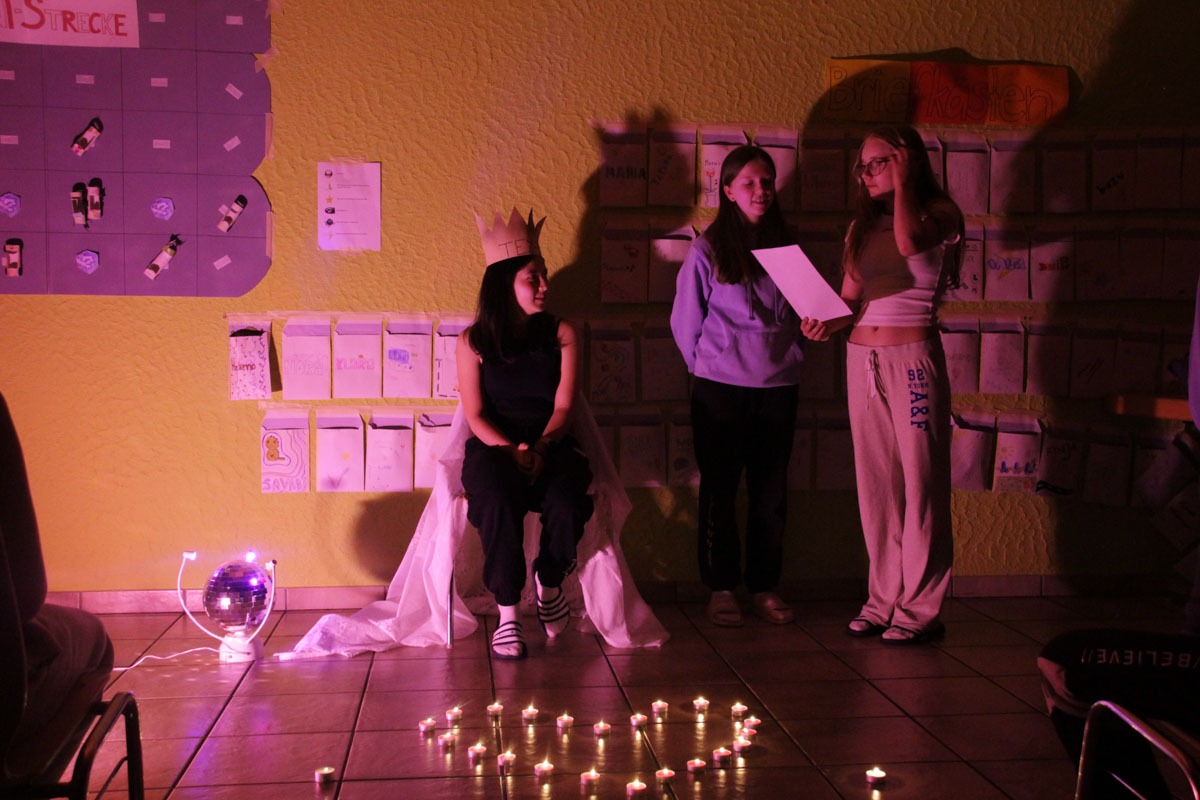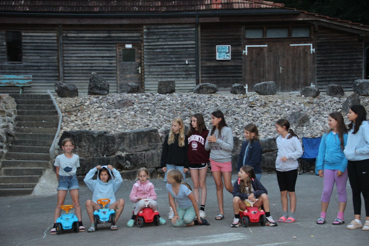 Nachdem wir den Tag mit einem leckeren Frühstück gestartet haben fuhr uns Daisy mit ihrem Rennwagen über den Weg, doch was sehen wir da…..🤯 Daisy‘s Fahrzeug dampfte und qualmte aus allen Seiten 🏎💨. Ihr Fahrzeug hatte dringend einen Service nötig und sie bat uns um Hilfe🔧. Wir liessen uns nicht zweimal fragen und spielten ein spannendes und abwechslungsreiches Essensersteigerungsgeländespiel, um genügend Kraft zu tanken, damit wir Daisy‘s Fahrzeug reparieren konnten. Die Mädchen zeigten beste Leistungen und bewiesen ihr können als Mechanikerinnen👩🏻🔧. Daisy war sehr dankbar um unsere Hilfe und die Aufgabe für den heutigen Tag war erledigt 🤗. Anschliessend übernahmen unsere HL‘s (Hilfsleiterinnen) das Lead und stellten zusammen mit den Blauringmädchen einen schlammigen Hindernisparcour auf, welche unser jüngstes Leitungsmitglied durchlaufen durfte. Am Abend fand die traditionelle Zeremonie statt. Wir freuen uns, Teya, neu im Leitungsteam begrüssen zu dürfen!🩵 Dies feierten wir ehrwürdig und gingen zufrieden ins Bett. Gute Nacht 👋🏽💤